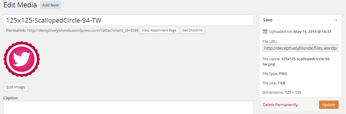 - On the Right side, you will see “File URL.” Copy that hyperlink. (I.e. the hyperlink for my Twitter icon was https://deceptivelyblonde.com/wp-content/uploads/2014/05/125×125-scallopedcircle-94-tw.png