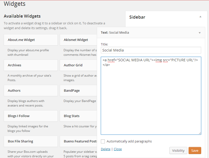 - Drag the “Text” widget onto your Sidebar. This will allow you to import the HTML Code.
