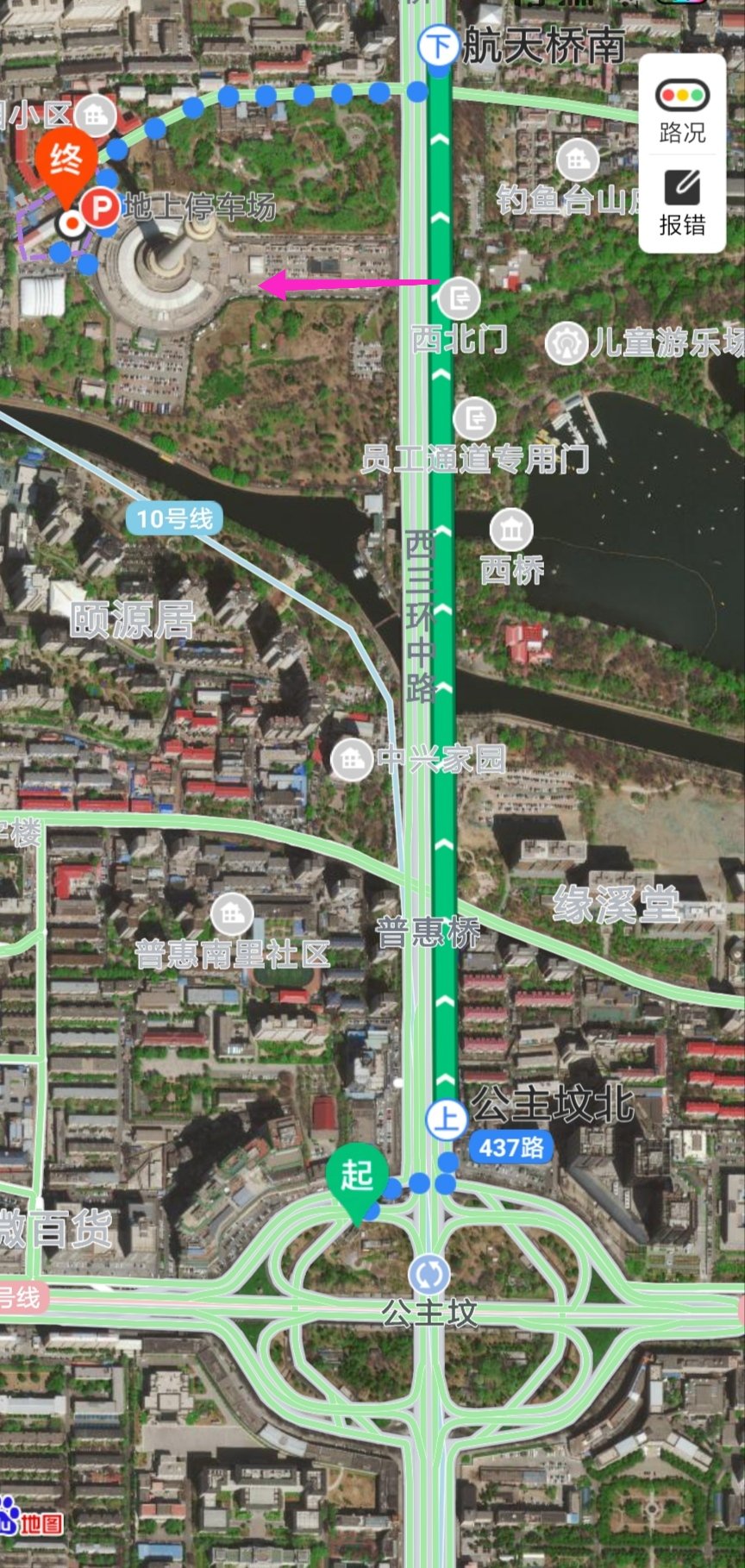 Take line 1 or 10 to Gongzhufen Station (exit A). Follow map directions to cross over to the bus station (about 5 minute walk). Take any of the buses shown (437 is 1 stop, 977 is 2 stops) the correct number of stops. Get off and see the tower!